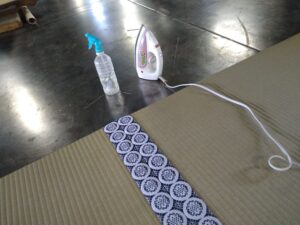 只今、紋縁の表替え作業に没頭中です。畳同士柄合わせ、畳の端に紋が欠けずに乗せるのに縮めたりし、紋縁にシワが出来てしまったらアイロンで整えます。